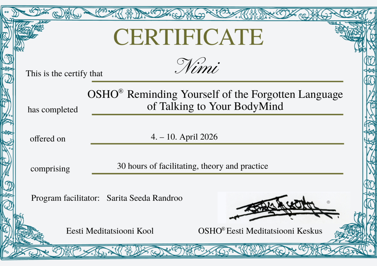 Juhendajaks õppimine EI EELDA EELNEVA KOGEMUSE OLEMASOLU. Küll aga on OSHO® öelnud, et ‘Tuletades meelde unustatud keele rääkides oma KehaMõistusega’ protsessi saavad juhendada vaid naised.