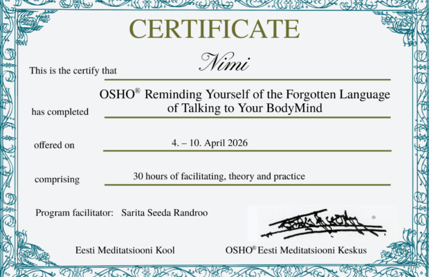 OSHO® ‘Tuletades meelde unustatud keele rääkides oma KehaMõistusega’ viib kergesse transiseisundisse, milles on kombineeritud sügav lõõgastus ja erksus. Saadakse sõbraks iseendaga – just sellisena nagu Sa oled – puhtal armastaval moel, ilma ainsagi nõudeta, tahtmiseta, hinnanguta…