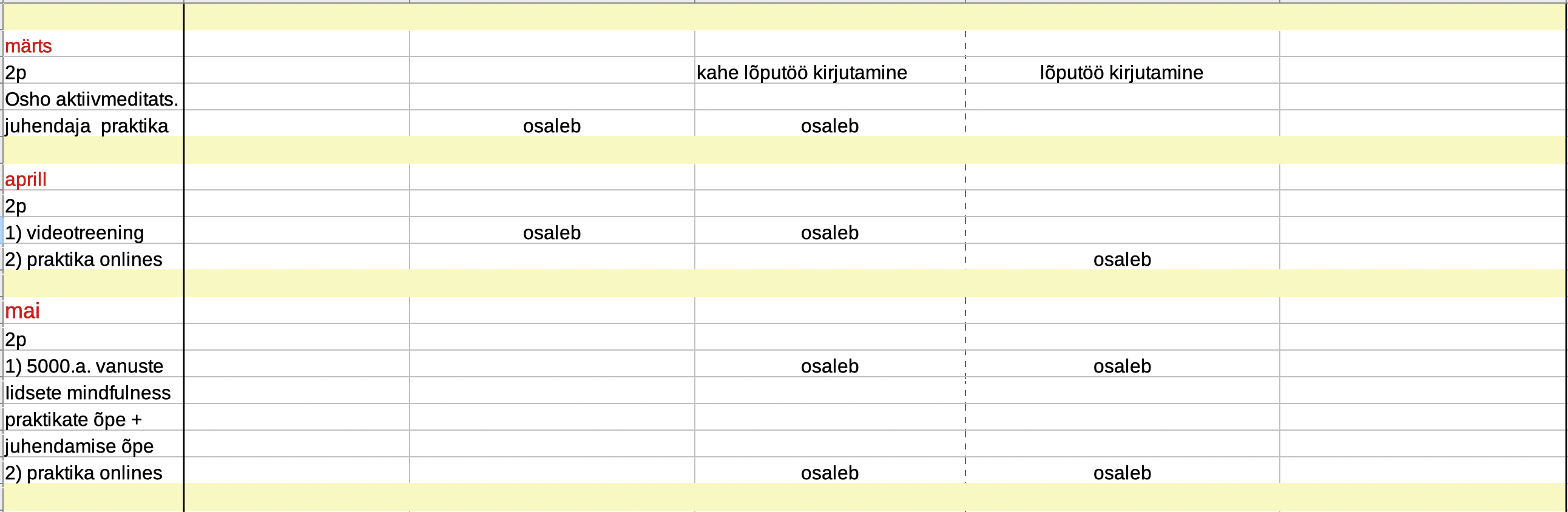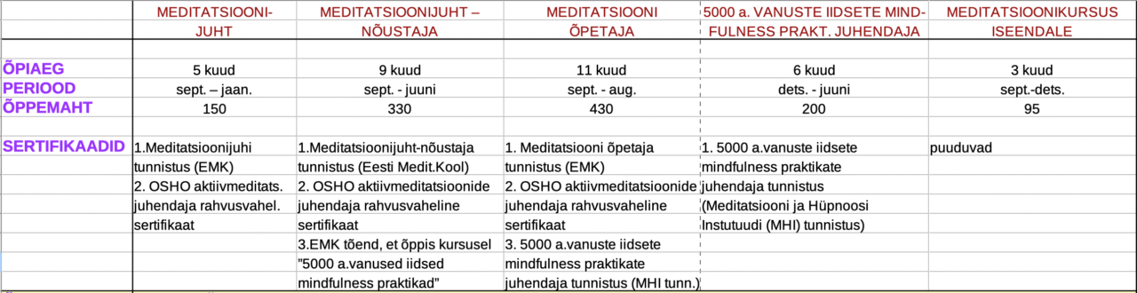 – süvaõpe ja meditatsioonide juhendamise õpe (kõik peale Meditatsioonikursus iseendale)