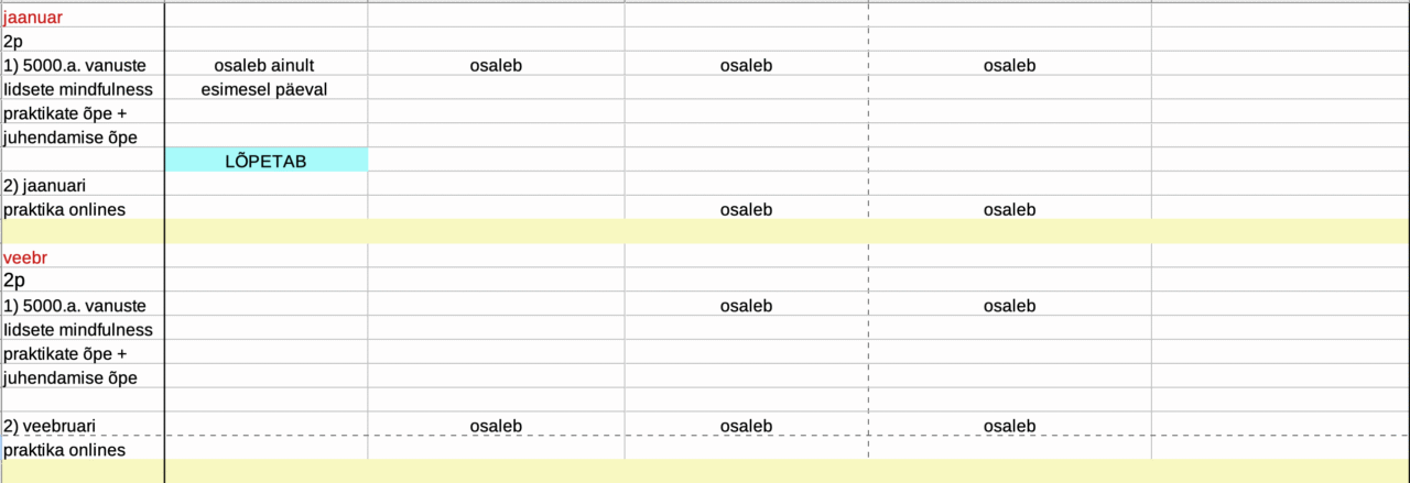 Õppegrupid alustavad koos, kuid lõpetavad eri ajal (v.a. 5000a vanuste iidsete mindfulness praktikate juhendajate õppegrupp, kes alustab dets.2025.a.)
