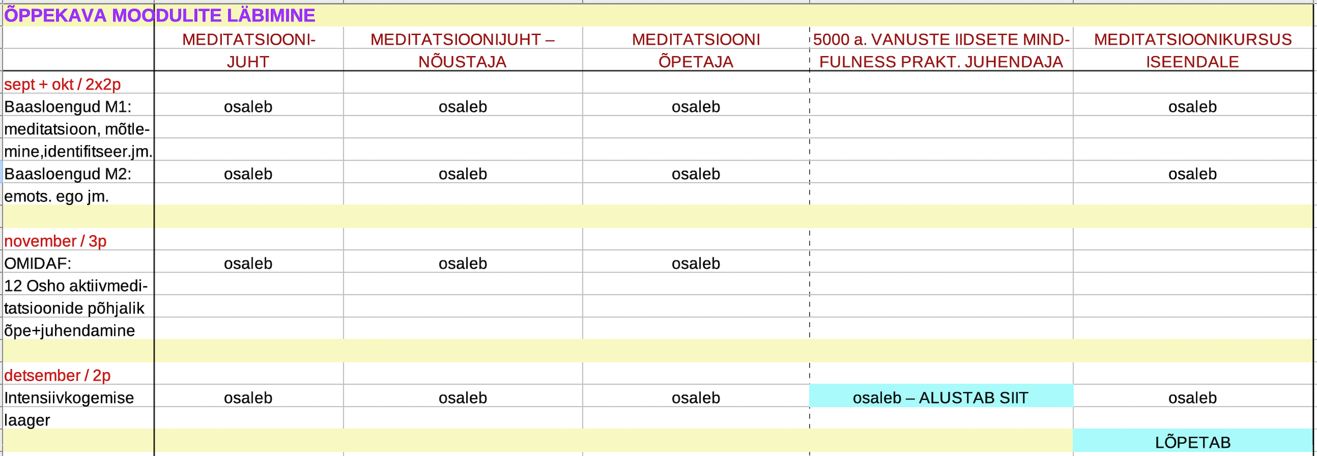 Õppijad, kes õpivad kursusel ‘Meditatsioonikursus iseendale‘ läbivad samuti sama õppekava osaliselt ja info on SIIN.